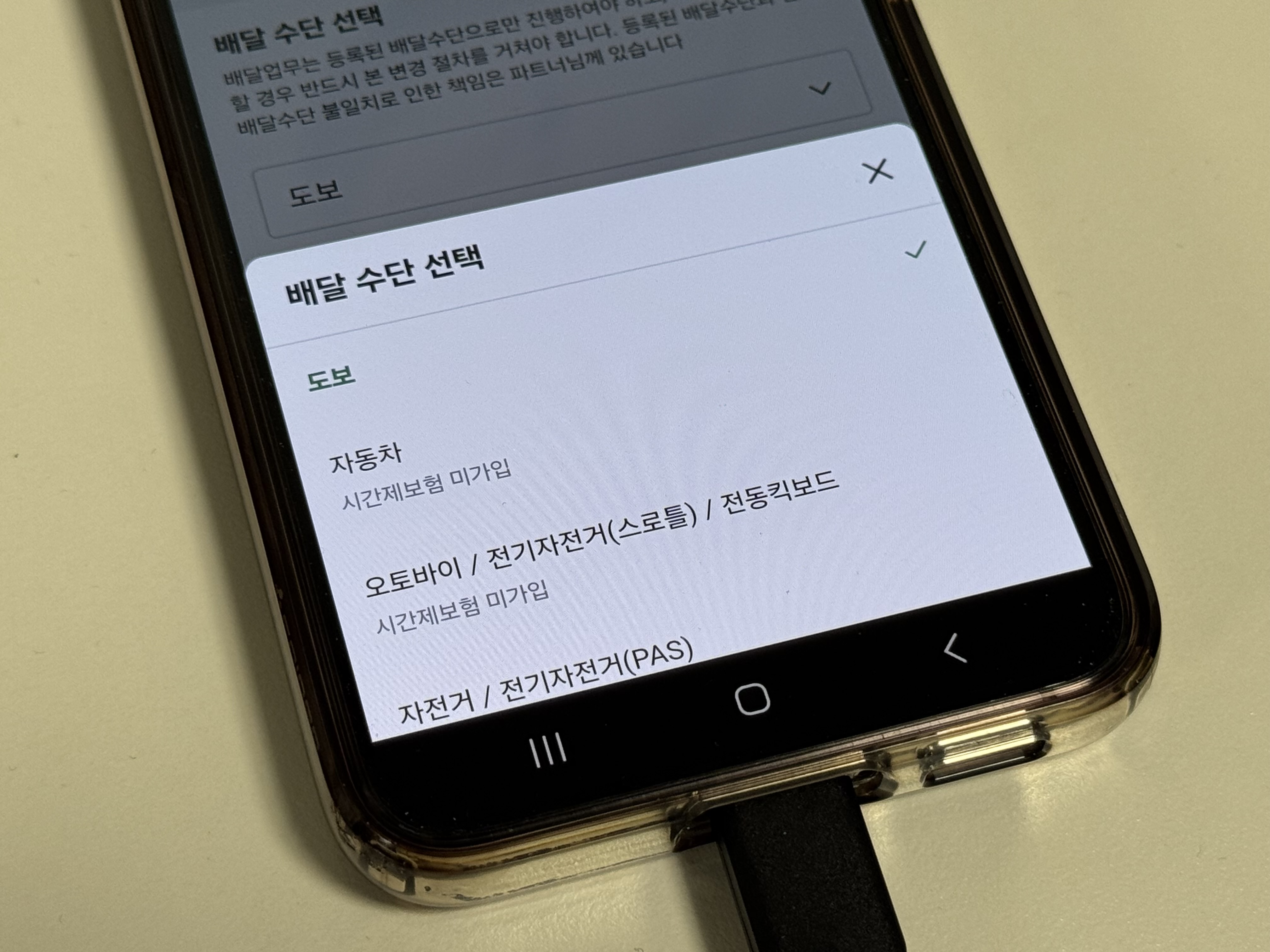 배민과 쿠팡이츠 사진. 배민은 전기자전거 (PAS)와 킥보드를 별개로 취급하고, 쿠팡이츠는 전동킥보드-오토바이-전기자전거(스로틀)을 하나로, 자전거 / 전기자전거(PAS)를 하나로 묶는다는 차이점이 있다.